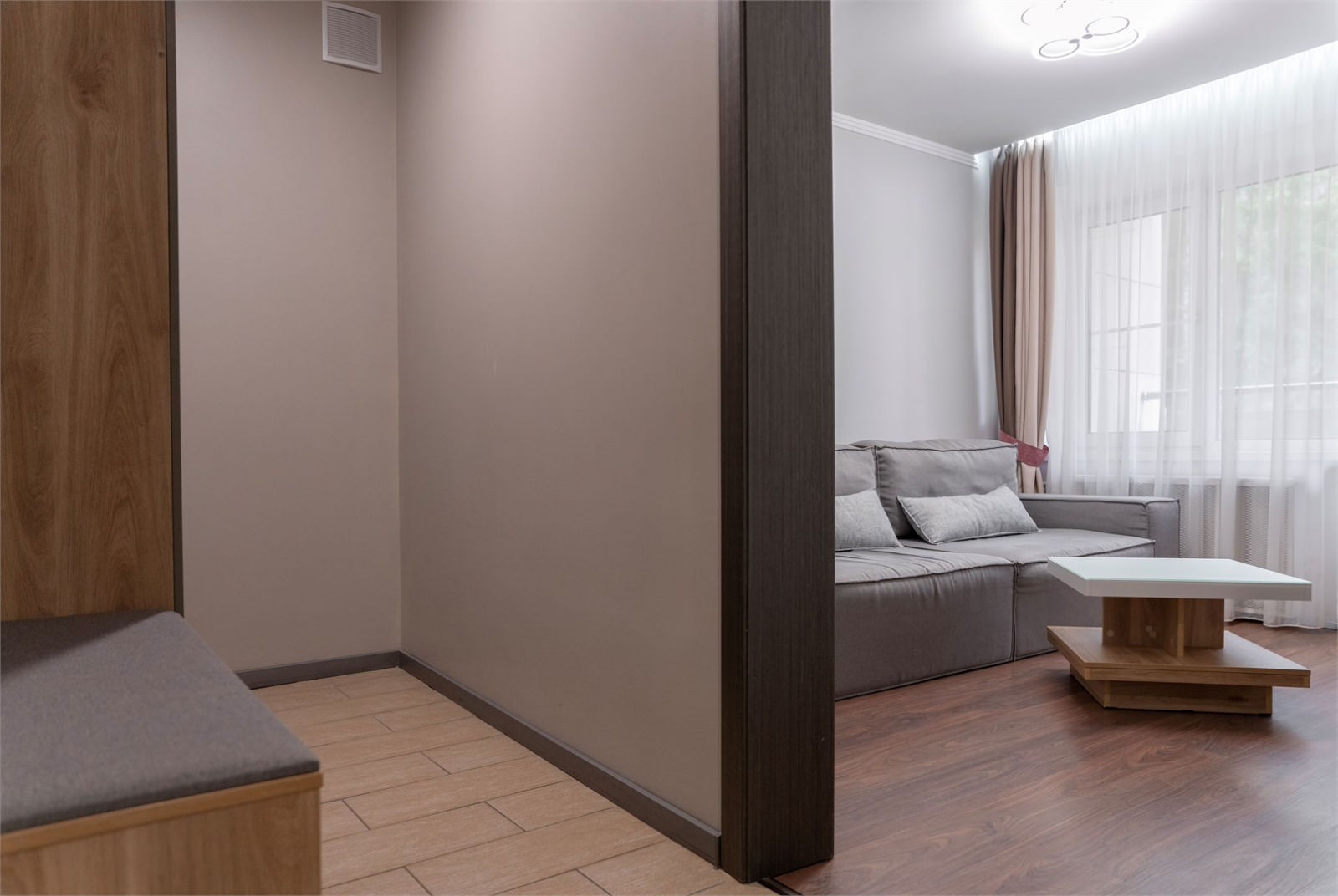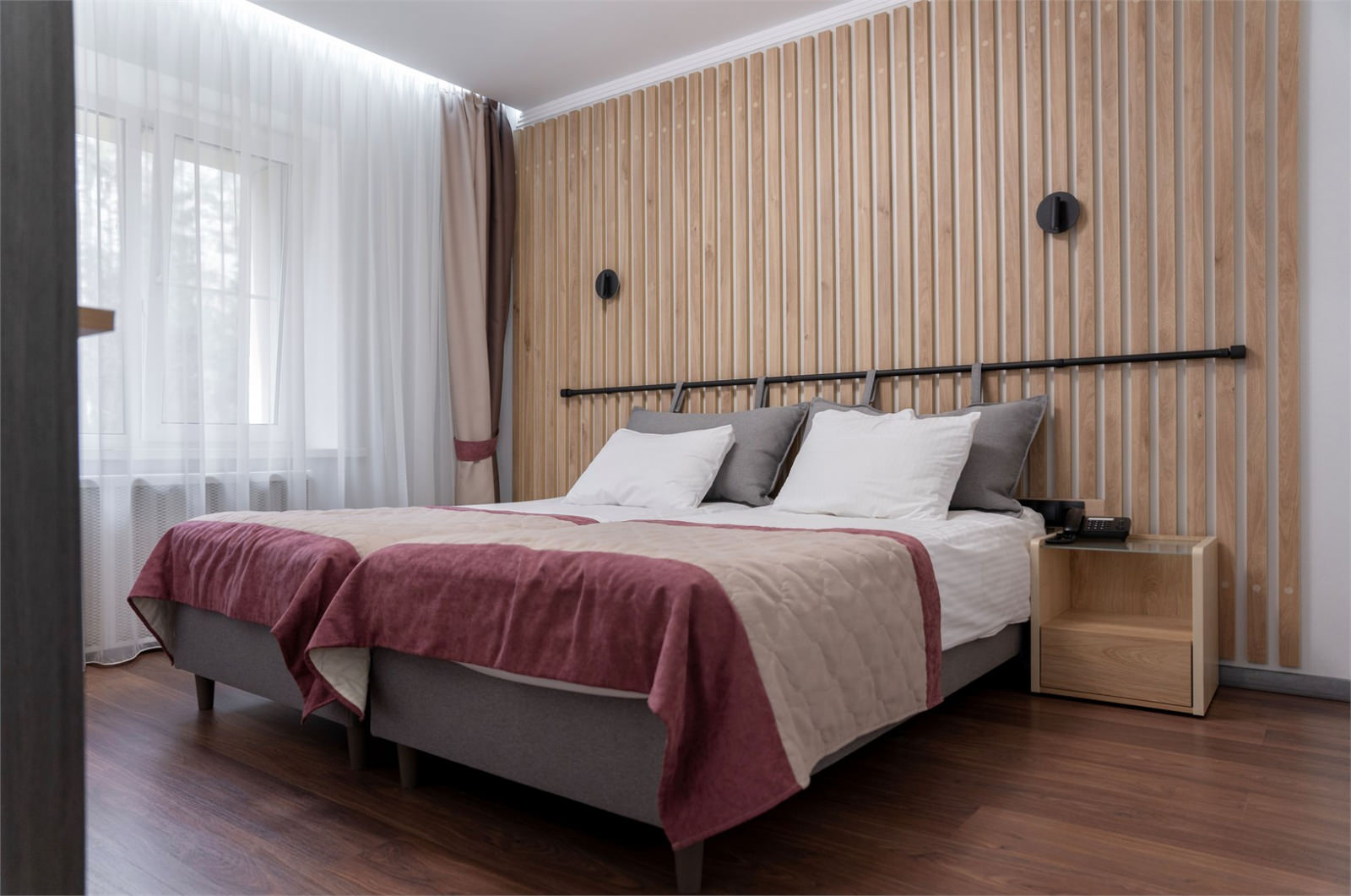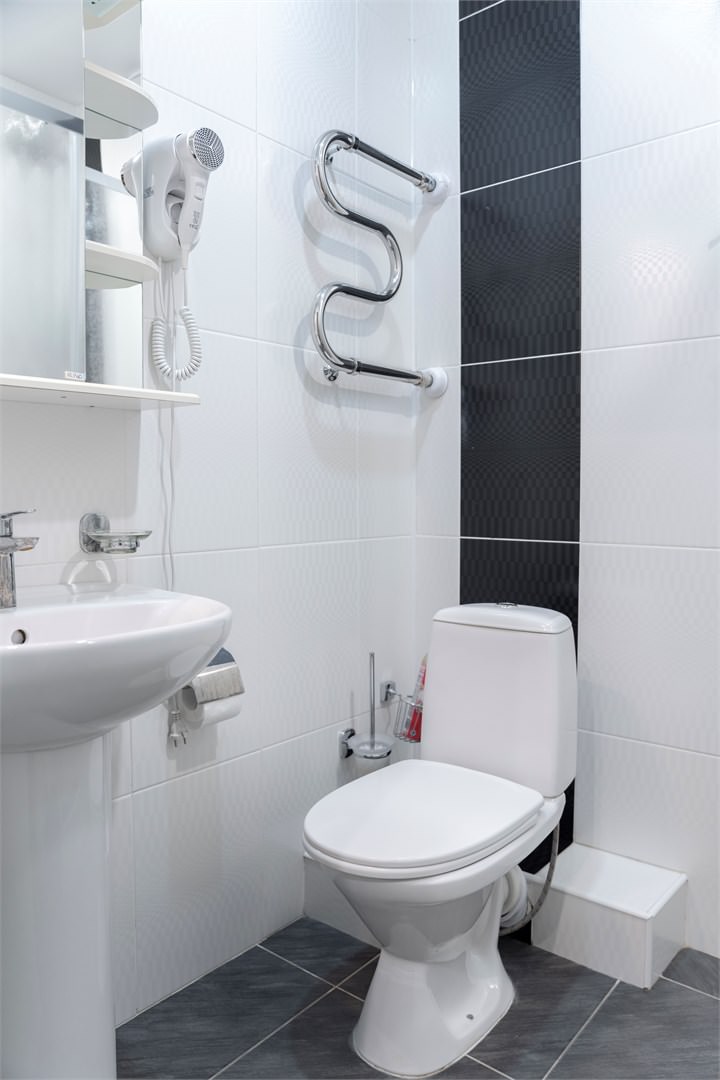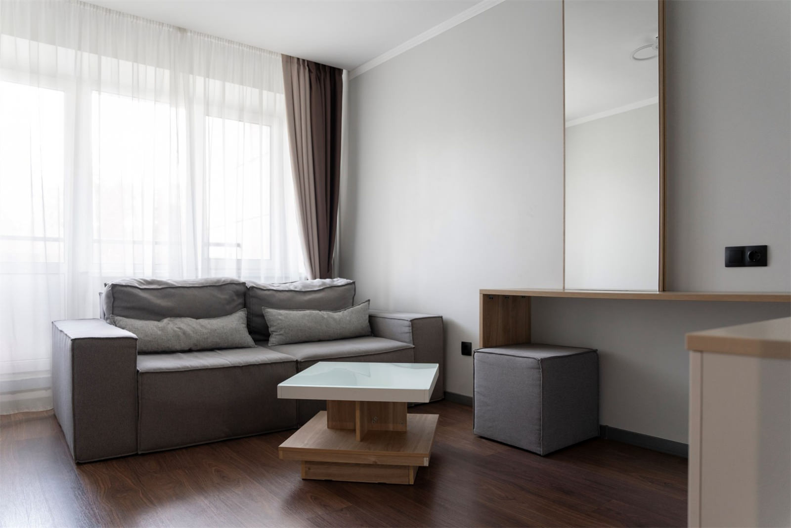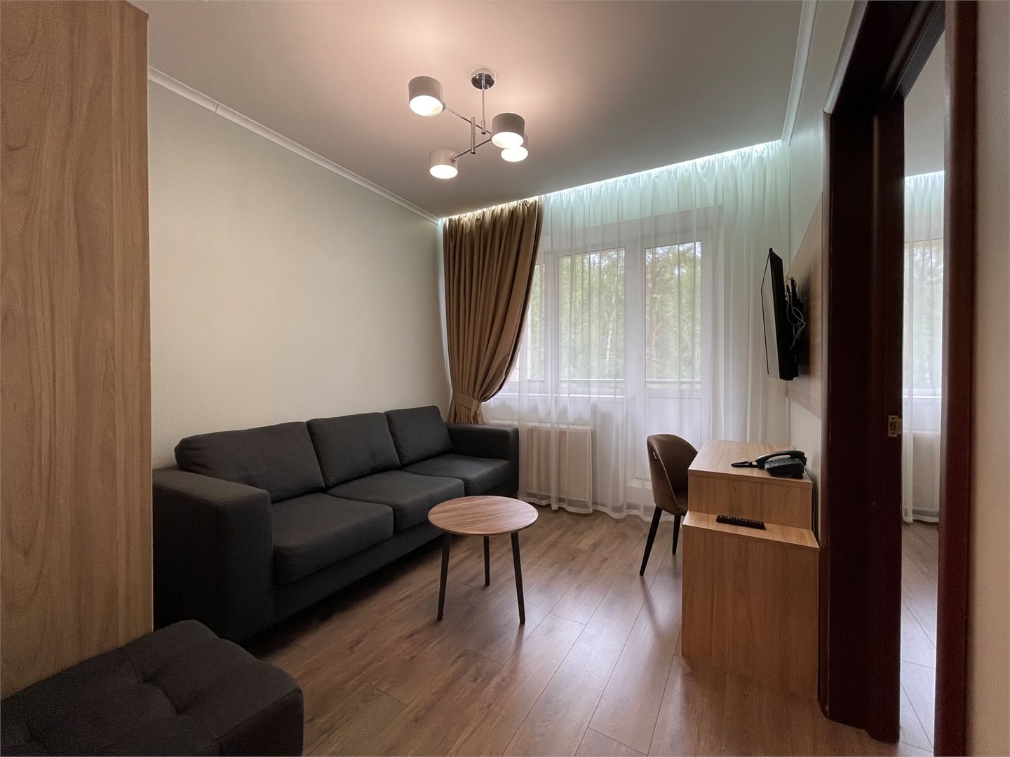 Двухкомнатный номер оснащен современной техникой и удобной мебелью.