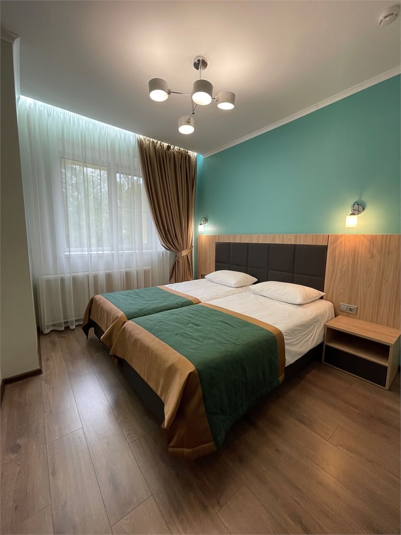 Здесь есть телевизор, холодильник, чайник, диван и две односпальные либо одна двуспальная кровати.