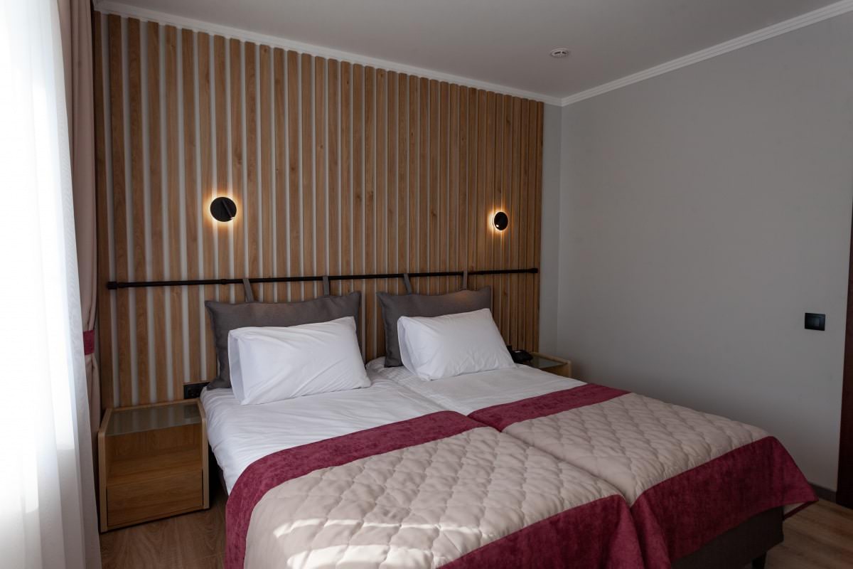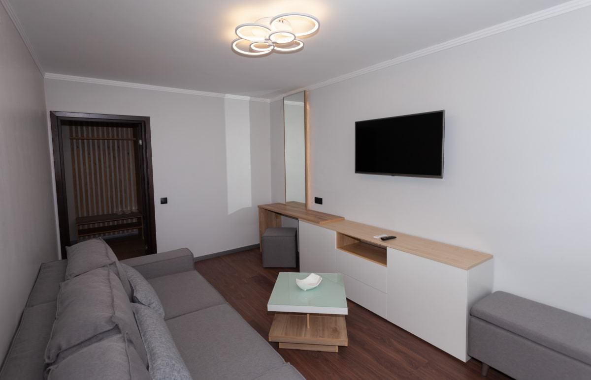 Здесь есть телевизор, чайник, холодильник, двуспальная кровать или две односпальные кровати, диван.